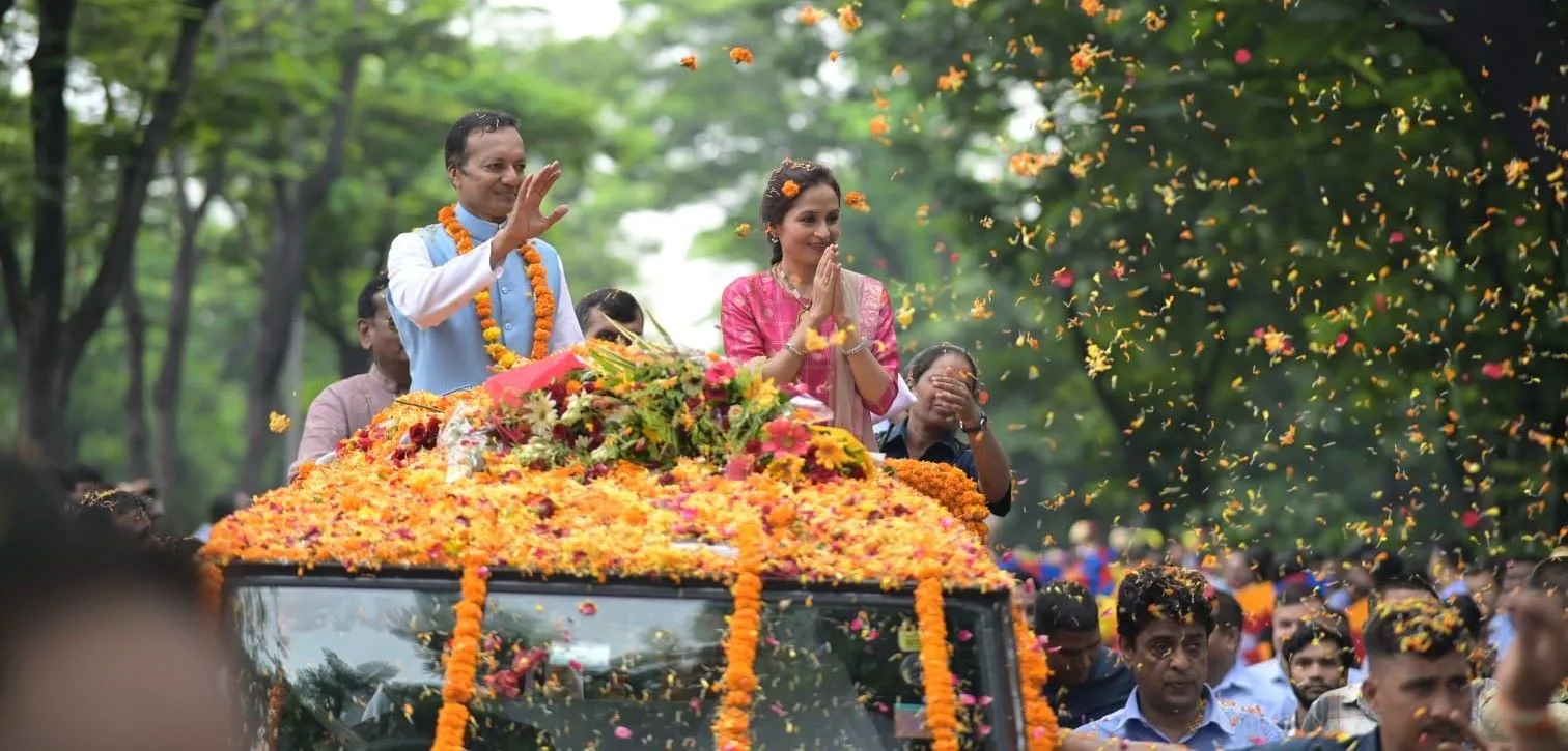 उनका काफिला जेएसपी परिसर से होते हुए ओपी जिंदल ऑडिटोरियम के लिए निकला। इस बीच पूरे रास्ते में दोनों ओर खड़े हजारों लोगों ने उनका ऐतिहासिक स्वागत किया। पूरे रास्ते लोग उन पर फूलों की बारिश करते रहे और इस यादगार लम्हे को तस्वीरों के रूप में संजोने के लिए भी लोगों में होड़ लगी रही।